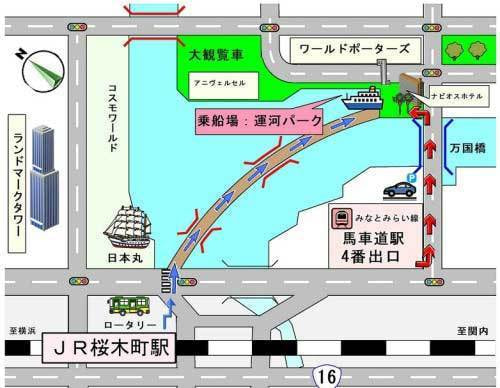 運河パークは横浜新港運河沿いに整備された公園です。乗船場所はワールドポーターズの前に設置された観光船専用桟橋です。JR桜木町駅、みなとみらい線・馬車道駅より徒歩でご来場いただけます。