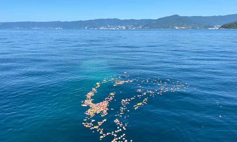 ベイブリッジ沖に広がる献花——横浜ならではの景色とともに